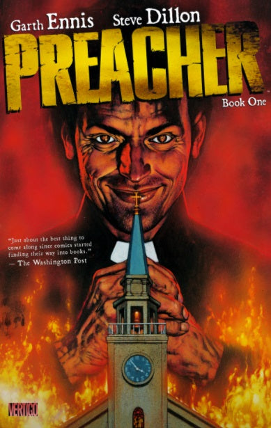 PREACHER #1-12-plus pinups from PREACHER #50 and #66-are collected in this new paperback that introduces Preacher Jesse Custer, Cassidy and Tulip. Disillusioned with his own beliefs, Custer begins a violent and riotous journey across the country in search of God, who has abandoned heaven.Ê